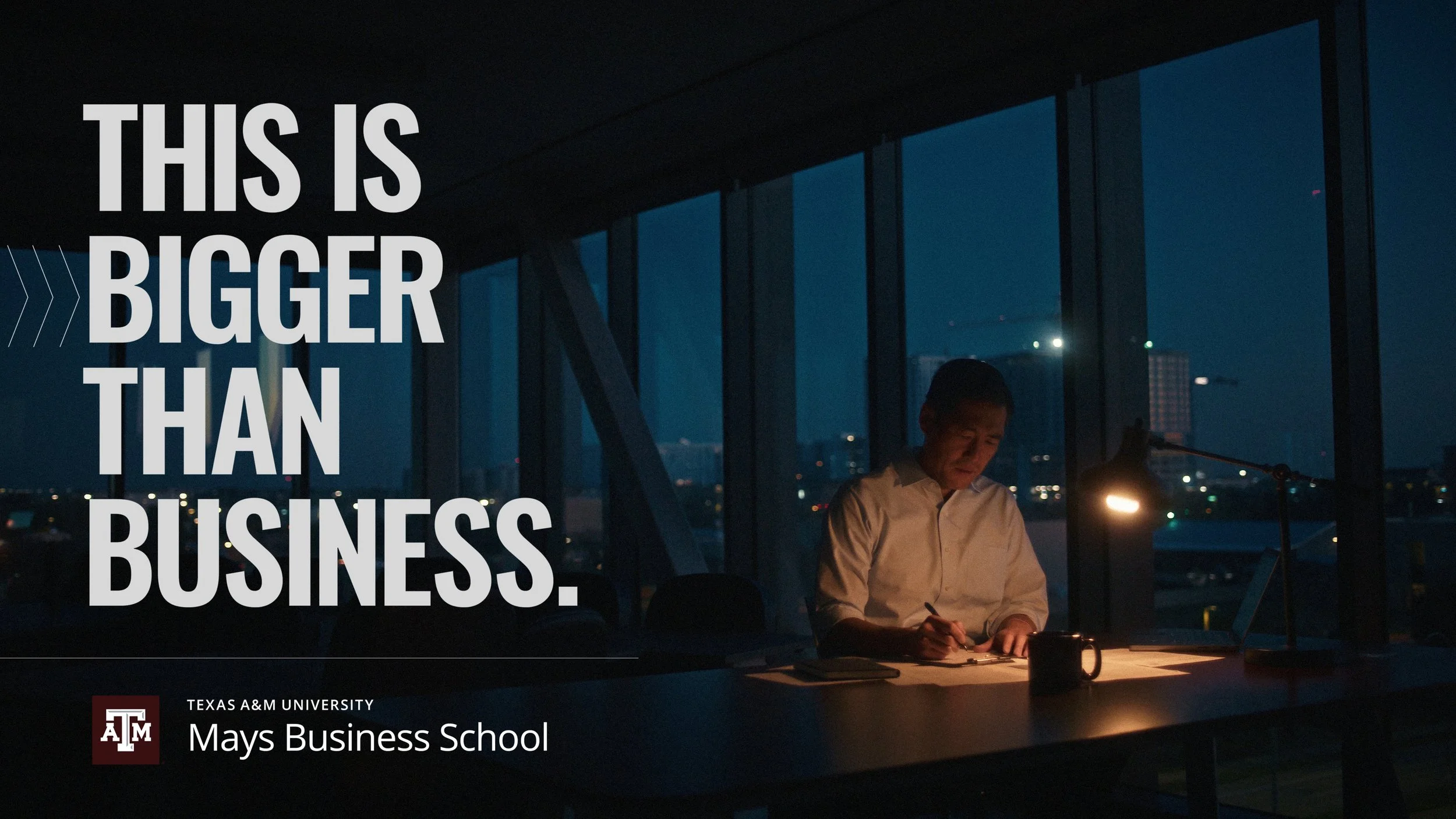 Mays Business School partnered with us to bring their “Bigger Than Business” campaign to life through a cinematic brand anthem built around the theme we developed from the opening line, ‘The world doesn’t wait for daylight, and neither do we’. The goal: show the purpose and discipline that define Mays students, faculty, and alumni, long before recognition.